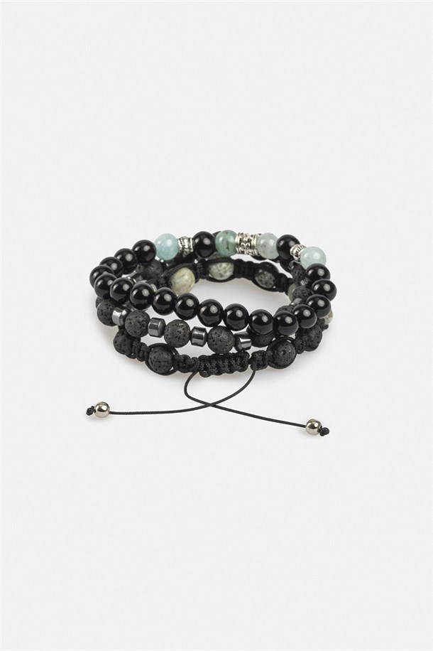 Siyah 3’lü taşlı bileklik, hoş görseli ile bileklerinize yeni bir soluk katarken; kombinleriniz ile de çok yakışacak. Ürün 3 adet ayrı bilekliğin birleşiminden oluşur. Gri, mavi, siyah ve metalik renkte bulunan taşların; örgü, düğüm ile mükemmel uyumunu içerir. Bir yönü mavi taşlara sahipken arka kısmı ise tamamen siyah taşlarla kaplı olması sayesinde; döndürerek çift taraflı olarak kullanmanıza da olanak tanır.