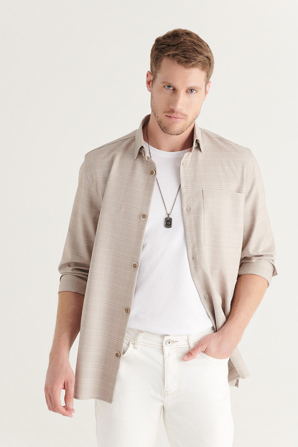 Bej Ekoseli Klasik Yaka Comfort Fit Cepli Gömlek