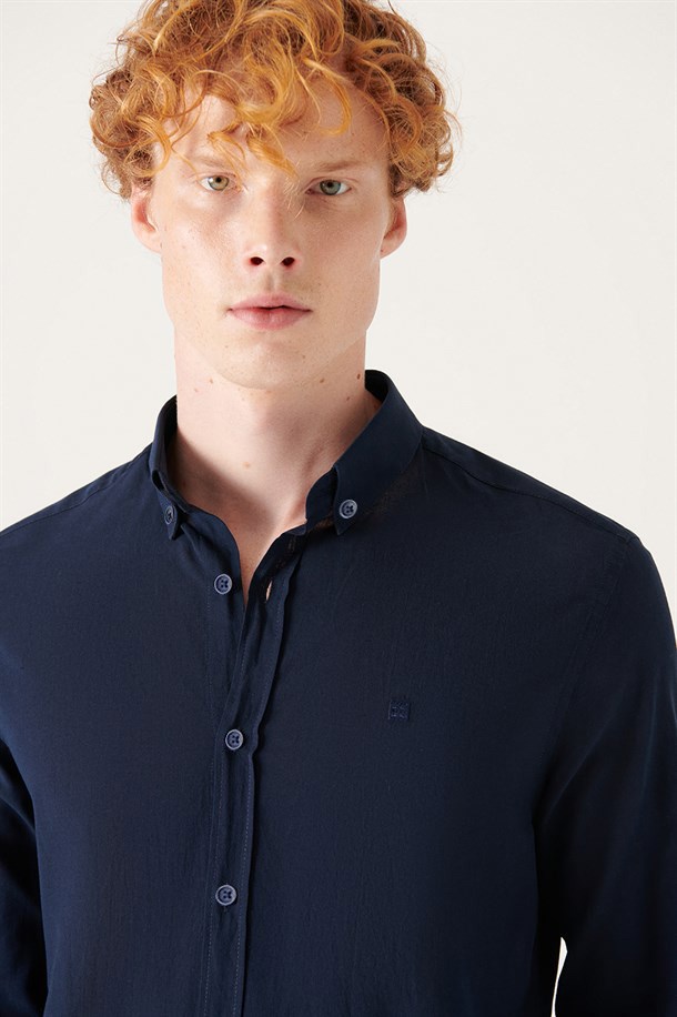 Lacivert Düz Alttan Britli Yaka Regular Fit Uzun Kol Vual Gömlek